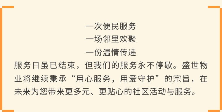 秋意渐浓,温情不减。盛世物业“十月便民服务日”在广大业主的欢声笑语中圆满落下帷幕。本次活动以“贴心服务,温暖到家”为主题,旨在将便利与关怀送到每一位家人的身边。现在,就让我们一起回顾那些充满温暖与感动的瞬间吧!