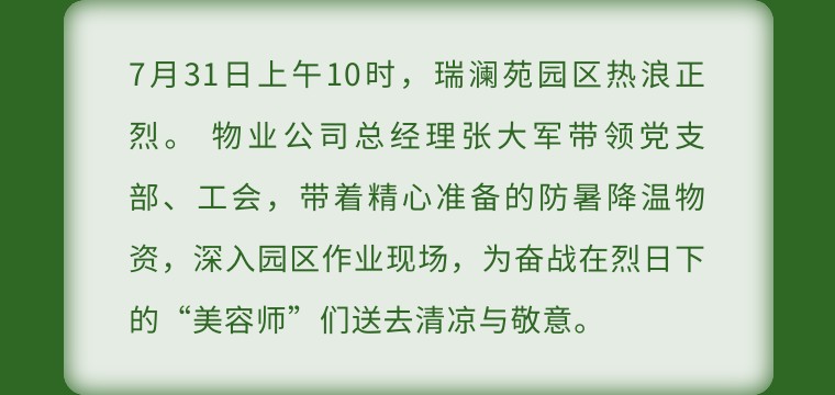 公司始终将一线员工的安全与健康置于首位。除此次集中慰问外,各小区均已设置清凉休息站,常备防暑药品与足量绿豆解暑水,确保员工在高温下能及时补充水分、缓解不适。