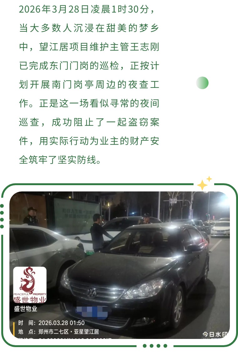 盛世物业将继续以王志刚主管为榜样,持续强化安保巡查力度、提升员工应急处置能力,不断完善小区安全防控体系。我们将用每一次认真的巡查、每一次果断的处置,换业主的安心与放心,与全体业主携手共建平安家园,让守护的温暖,照亮小区的每一个夜晚。
