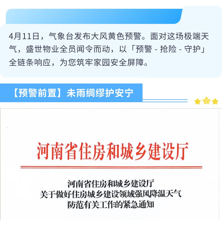 大风预警发布后,盛世物业应急体系即刻启动:维修团队连夜加固路灯基座、检查楼顶设备,为脆弱绿植搭建防风支架;客服管家逐户推送大风预警信息,提醒关闭门窗、收拢阳台杂物;安保团队加密园区巡查频次,重点排查高层建筑外立面瓷砖、空调外机支架等易坠落隐患。
