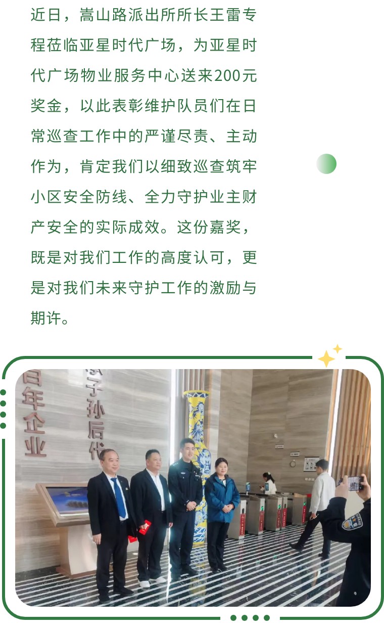 此次获得表彰,是荣誉更是鞭策。未来,亚星时代广场物业服务中心将以此次表彰为契机,持续强化巡查工作、细化巡查举措,引导维护队员坚守巡查岗位、提升履职能力,进一步织密小区安全防控网络。我们将始终坚守服务初心,牢记守护使命,以更严谨的态度、更务实的行动,做好常态化巡查工作,加强与嵩山路派出所的联动协作,全力打造平安、和谐、宜居的小区环境,不辜负派出所的认可与每一位业主的信任与托付。