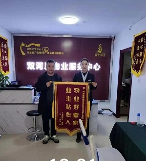 2020年11月19日上午,双河居小区7号楼2单元902室业主岳先生来到物业服务中心,为7号楼楼管郭琳琳送来一面锦旗。