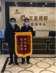 2021年1月15日一大早,业主拿着一面锦旗来前台,说是要找小管家石超,要送锦旗给他,当面谢谢他。前台联系管家石超,业主见到管家后,将锦旗当面赠予他,并表示非常感谢。