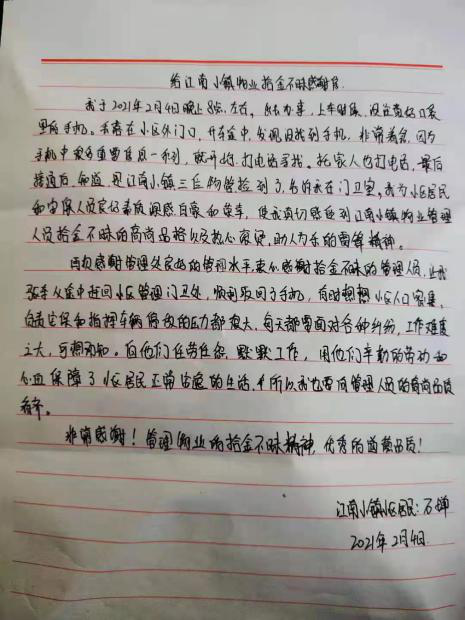物业工作人员拾金不昧、为业主考虑的精神感动了业主,业主为工作人员优秀的道德品质给予了高度肯定。薄薄的纸张,淳朴的文字,充满了对工作人员的肯定,也是物业工作者在新春来临之际收到的一份最好的礼物。