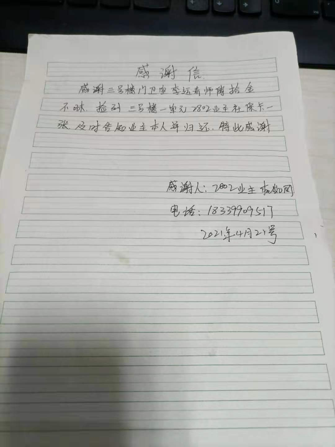 不得不说,在如今的时代,网络信息是如此的强大,很快找到失主并物归原主。业主对此表示非常感谢!写下了这封感谢信,简短的几句话,却蕴含了满满的正能量,足以表达了对工作人员的尽职尽责给予了认可和肯定。