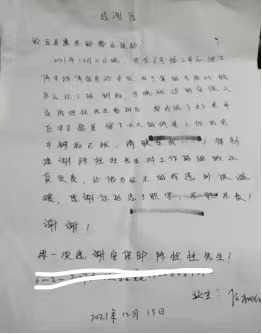 2021年12月14日郦都6号楼2单元业主任女士为维护部巡逻队员陈栓柱收送来一封感谢信。