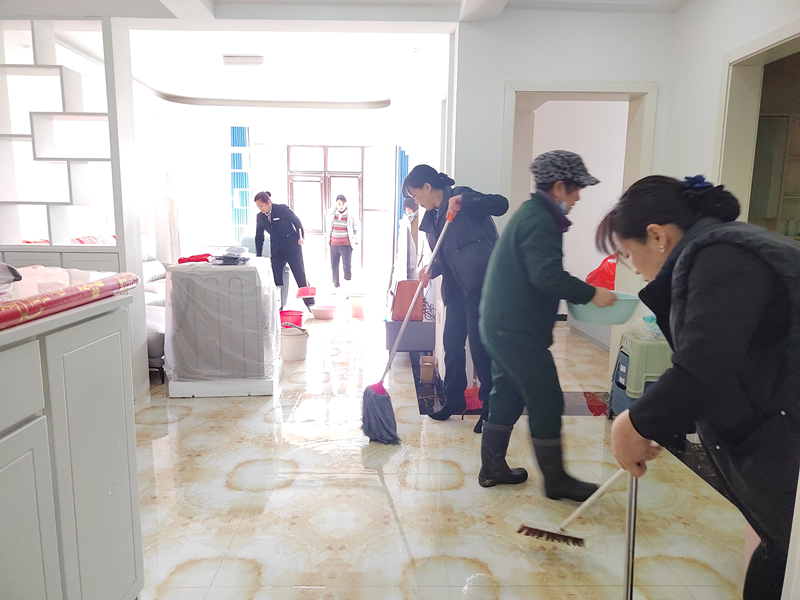 韩金娥马上行动起来,帮助业主清理房间。其他楼管听说后,没有组织,没有动员,大家自发来到业主家,顾不上水深,一起帮忙扫水。有用铲斗铲水、有端着盆子倒水的、有帮忙收拾东西的……厨房里,客厅里,卫生间里,卧室里到处都是她们忙碌的身影。半个小时后,水没有了,地板亮了!她们仍没顾上额头上的汗滴,也没顾上湿漉漉的鞋子,尽力安抚着业主潮湿的心。